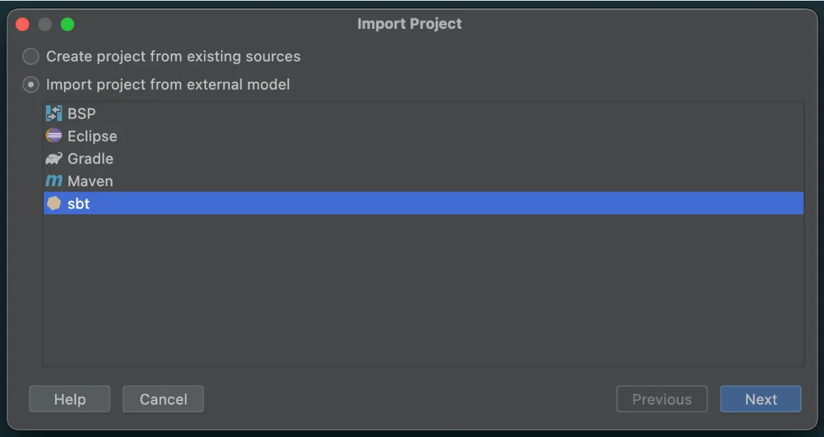 Select sbt as the external model